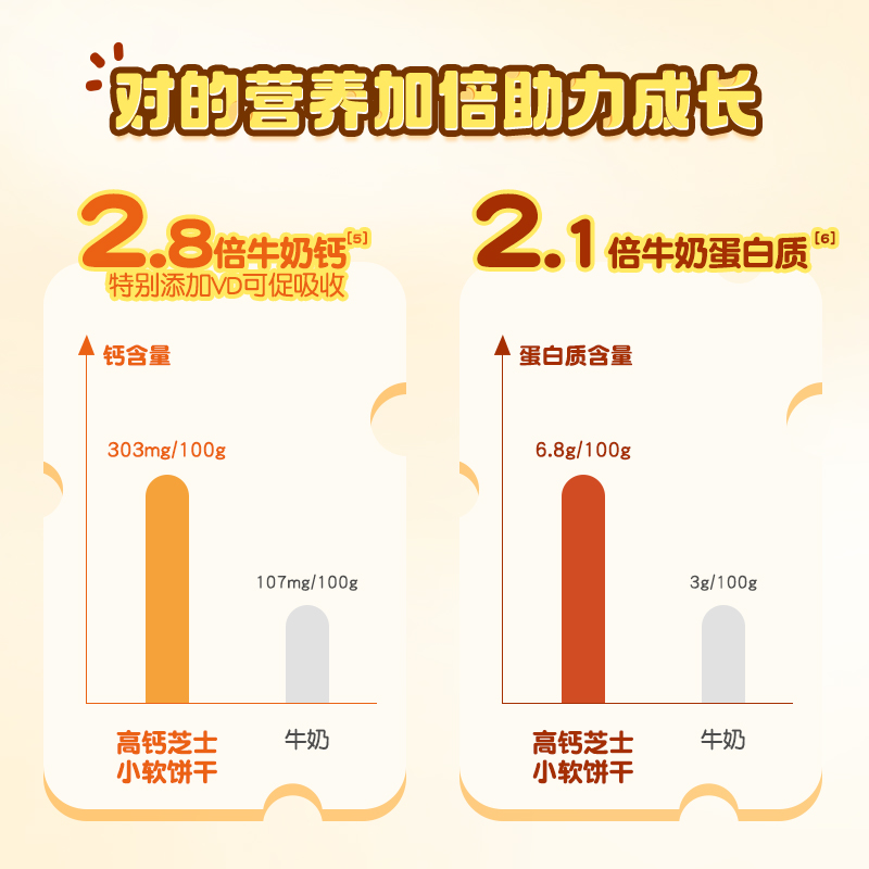 • 高钙+VD组合:每100g小软饼含钙量达300mg,搭配维生素D,促进钙质吸收,为宝宝骨骼发育提供双重保障。