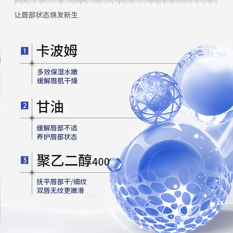 活性修复成分:添加尿囊素、泛醇(B5),加速唇部伤口愈合,缓解炎症。