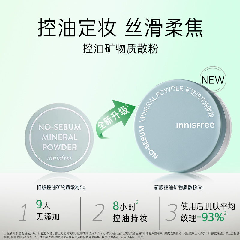 - 成分解析:精选济州岛天然矿物质粉末,无滑石粉、无酒精、无人工香精,敏感肌友好。 - 技术亮点:采用微细粉体处理工艺,粉质细腻如雾,上脸瞬间“隐形”毛孔,打造柔焦滤镜感。 - 贴心提示:含天然矿物质成分,开封后建议6个月内用完,避免受潮结块。二、适用场景:从早八到晚宴,全天候控油