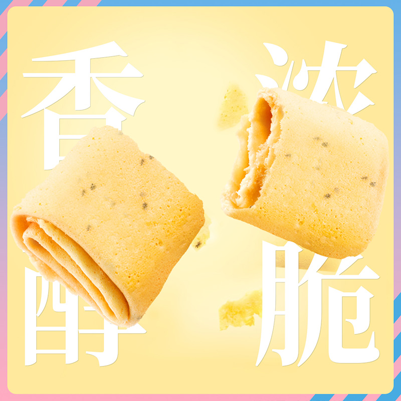 精选新鲜鸡蛋,每袋添加量≥25%,远超市场同类产品(普通鸡蛋卷鸡蛋含量约15%-20%)。高温烘烤后,鸡蛋的鲜香与黄油的醇厚完美融合,入口即化却留有淡淡蛋香回甘。