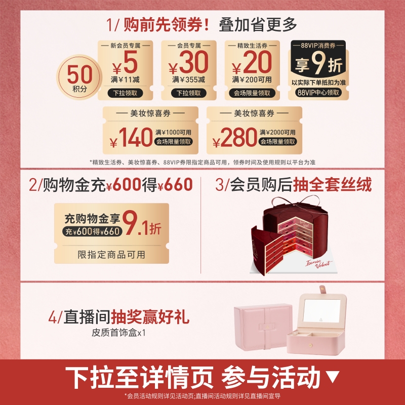 口红:丝绒哑光质地,添加柔焦粉末,隐匿唇纹,持妆不沾杯。