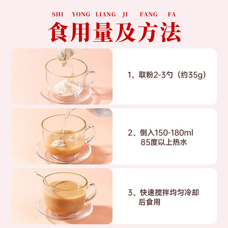 注意事项:孕妇需遵医嘱;经期量多者暂停饮用;冲泡后请于2小时内饮用完毕,避免结块。