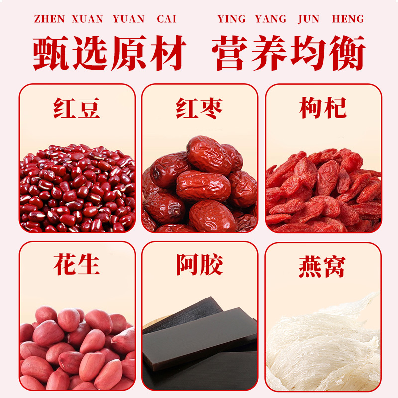 同仁堂传承“五红汤”经典方剂,以阿胶为君,红枣、红豆、红皮花生、枸杞为臣,辅以现代低温破壁技术,保留食材90%以上活性成分: