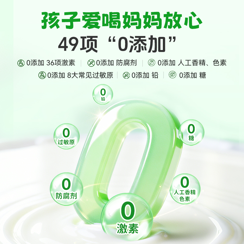 • A:创新“钙镁锌三效同补”配方,且通过SGS安全检测,0防腐剂、0人工色素,妈妈更放心。