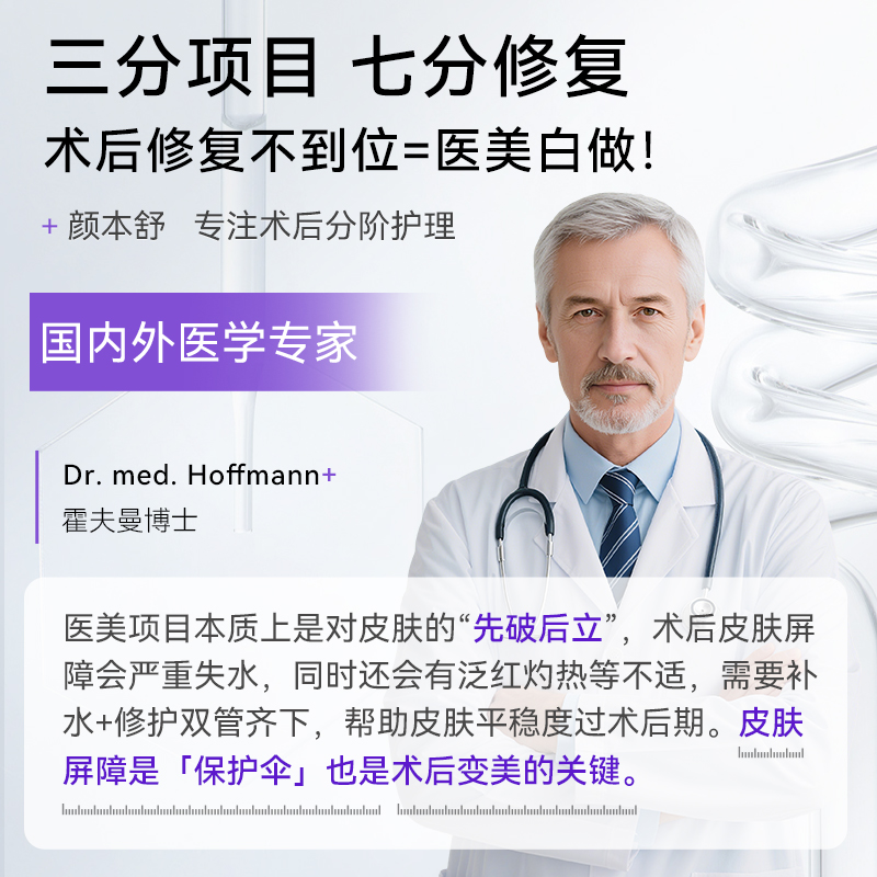 可孚颜本舒专为术后屏障受损设计,以医用重组胶原蛋白+透明质酸钠+神经酰胺构建“修复铁三角”,直击术后3大痛点: