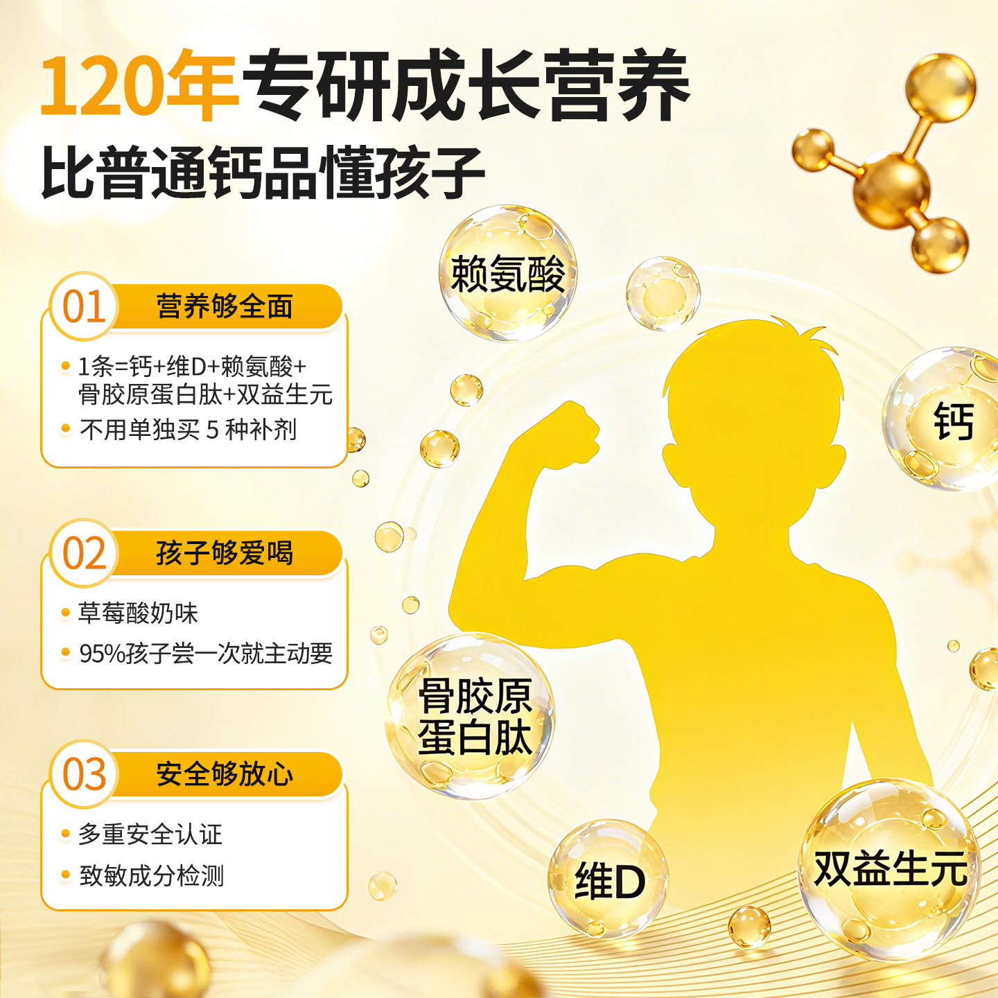 核心优势:双钙+有机锌+高D3组合,性价比与安全性兼得,解决“补了不吸收”“孩子不爱喝”两大痛点。