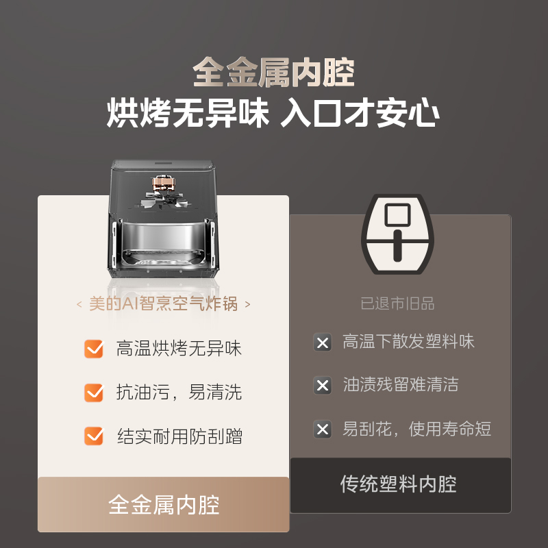 A:追求快速、低油、免翻面选空气炸锅;需要大容量烘焙选传统烤箱。美的这款结合两者优势,性价比更高。