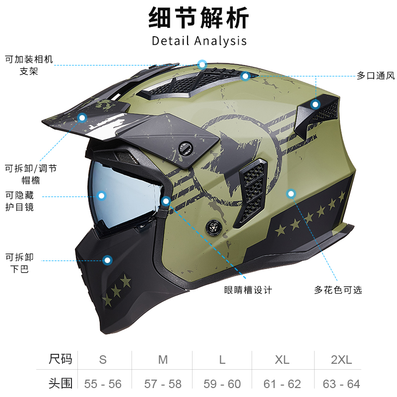 • 全盔模式:扣紧下巴扣,调节头围松紧带,确保贴合头部。