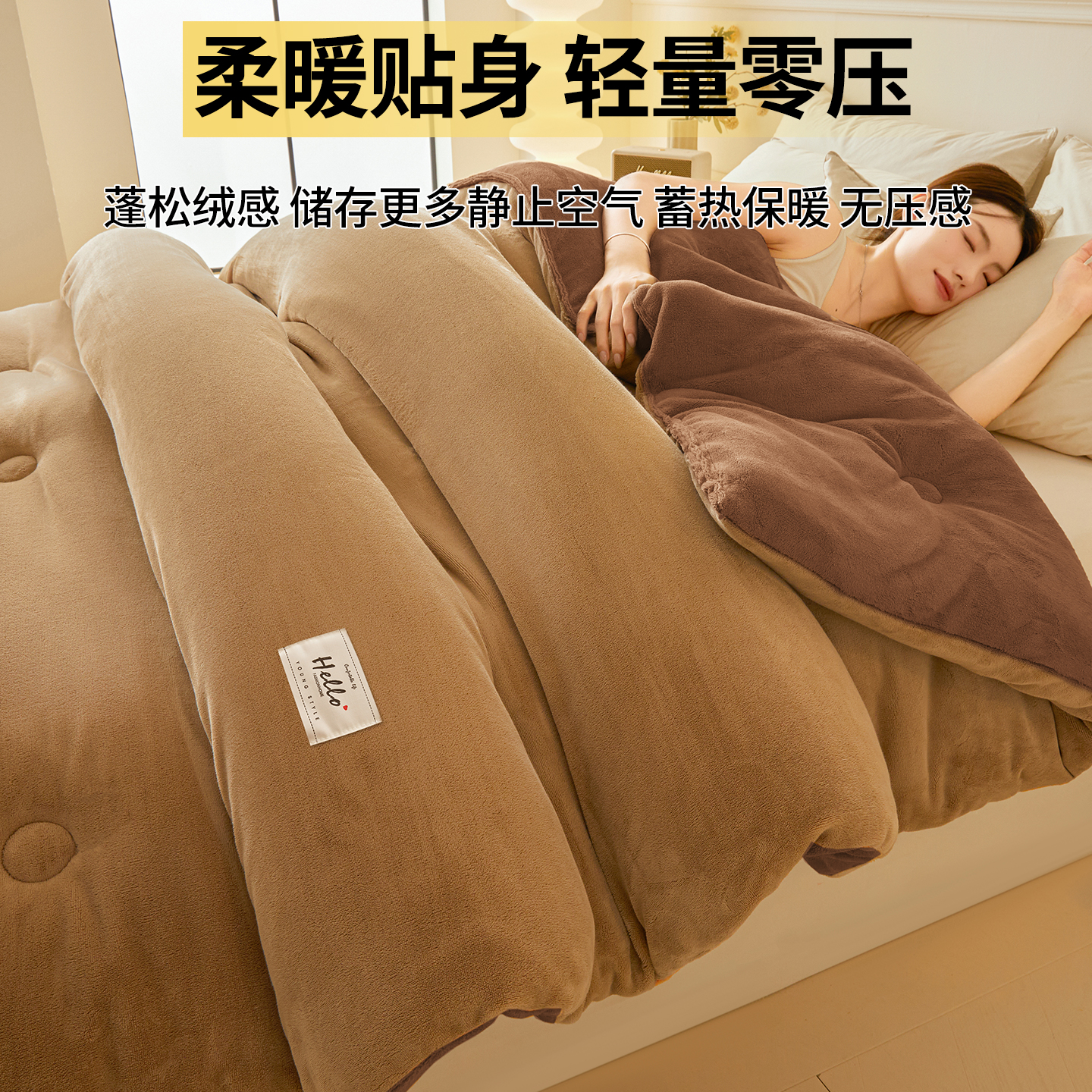 • 表层:采用高密度牛奶绒面料,纤维细腻如婴儿肌肤,触感柔软丝滑,贴身即暖,告别传统棉被的冰冷感。