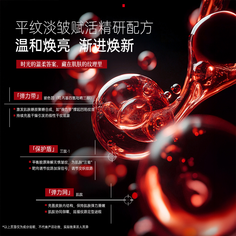 伊莎美尔玻色因抚纹精华水润肤大红瓶水,其核心成分——玻色因,被誉为抗皱界的“黑科技”。玻色因是一种具有生物活性的糖蛋白混合物,能够深入肌肤底层,促进胶原蛋白的生成,增强肌肤的弹性和紧致度,从而有效对抗因年龄增长、环境压力等因素导致的皱纹和松弛问题。与市面上其他抗皱成分相比,玻色因更加温和,不易引起肌肤敏感,适合各种肤质使用。