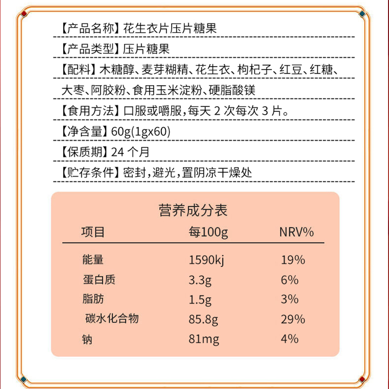 • 服用方式:每日2次,每次3-5片,温水送服或直接咀嚼(口感微甜,带有花生自然香气)。