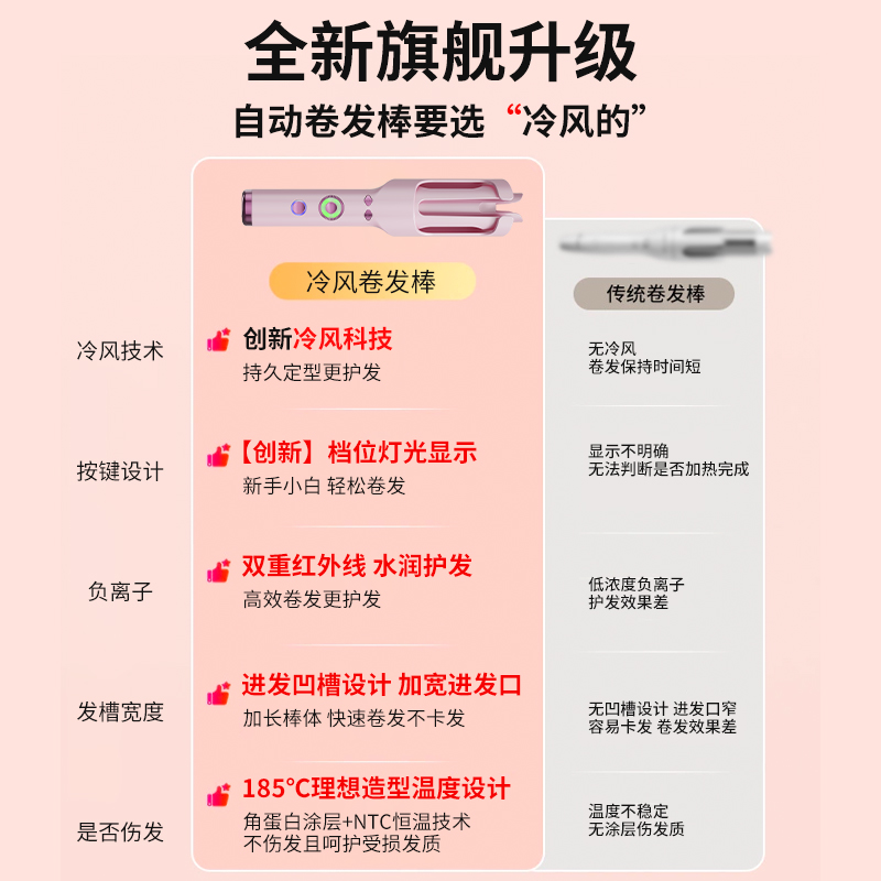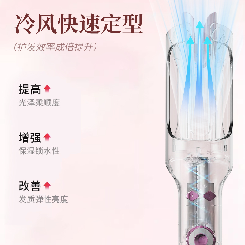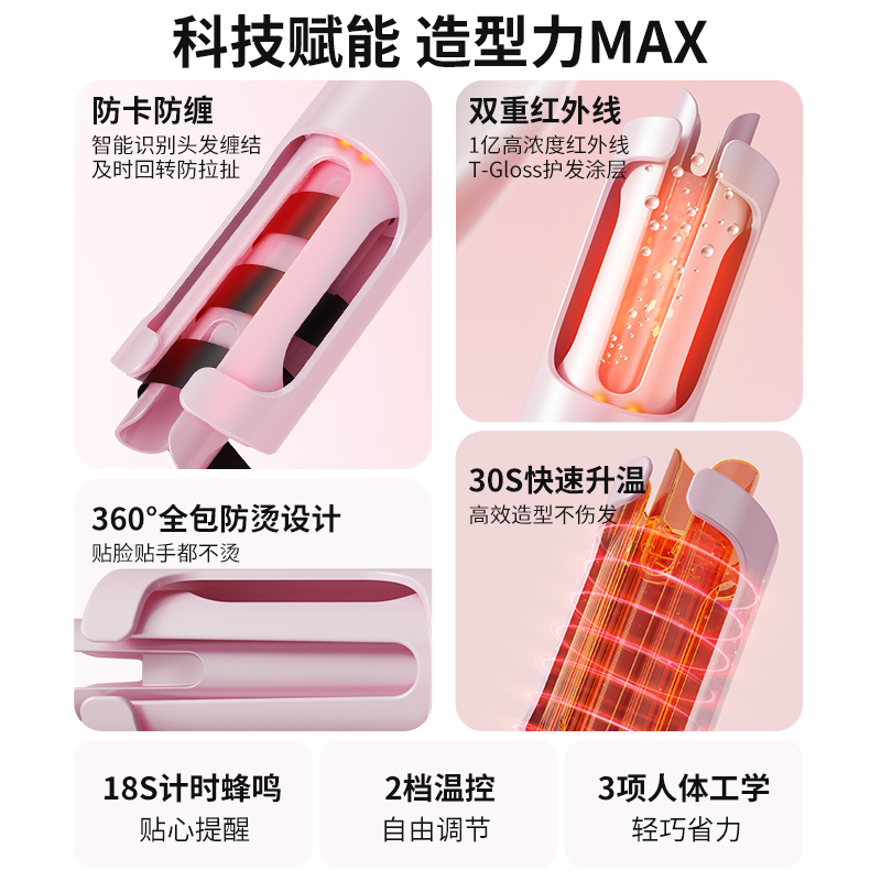 冷风科技,红光护发,蜂鸣提示音,NTC恒温,防烫隔热设计,60秒智断电,2档智能控温,一键卷出30毫米慵懒大卷,轻松拥有迷人大波浪