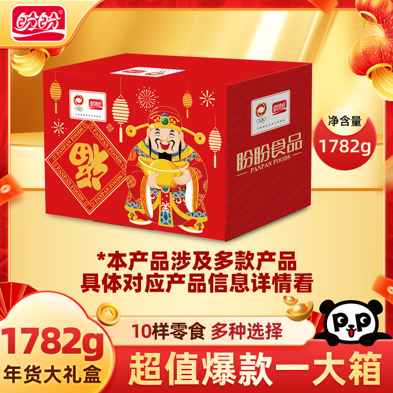 '盼盼财神到礼盒太棒了!巧克力味派香浓不腻,鸡味块和薯片都是我的最爱,乳酸菌面包也很健康,全家都爱吃!'、'年货送礼就选盼盼,包装喜庆,内容丰富,性价比超高!'