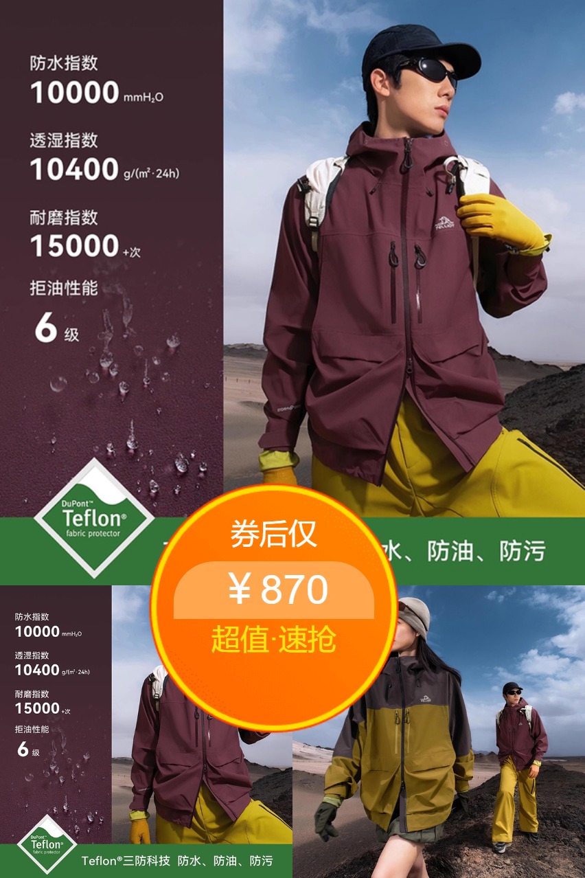 采用Teflon™三防科技面料,表层覆盖纳米级疏水膜,实现防水(静水压≥10000mmH2O)、防油、防污三重防护。内层搭载3D立体剪裁工艺,活动关节处预留15%延展空间,配合可调节风帽与魔术贴袖口,确保运动中零束缚感。面料通过-20℃低温抗裂测试,东北雪原到川西雨季均可胜任。