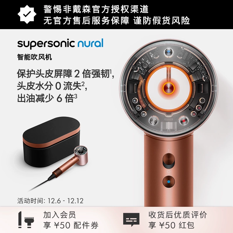 机身采用戴森专利V9数码马达,配合气流倍增技术,通过环形气流设计将风速提升至传统吹风机的3倍。外壳为高强度PC+ABS工程塑料,琥珀金色采用6层金属镀膜工艺,抗指纹且耐磨损。内置Nural™传感芯片,可实时感知头皮距离并自动调节温度,搭配55℃恒温护发模式,形成头皮保护屏障。