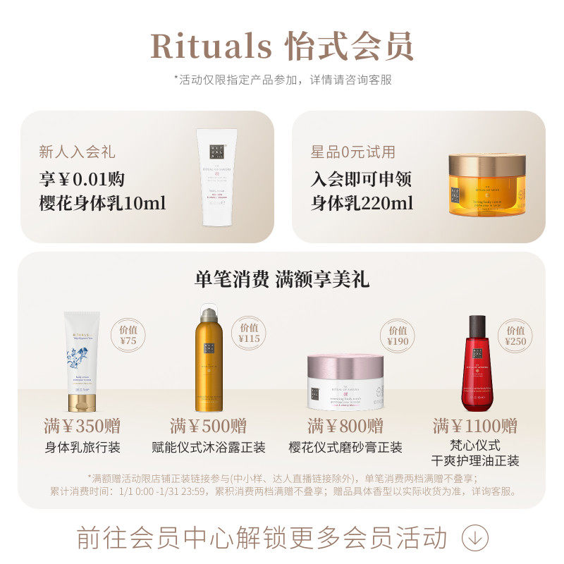 Rituals怡式香氛发泡沐浴露采用天然植物精油配方,包含乳木果油、椰子油及珍贵香氛精华,无硫酸盐、无矿物油,温和不刺激,敏感肌友好。