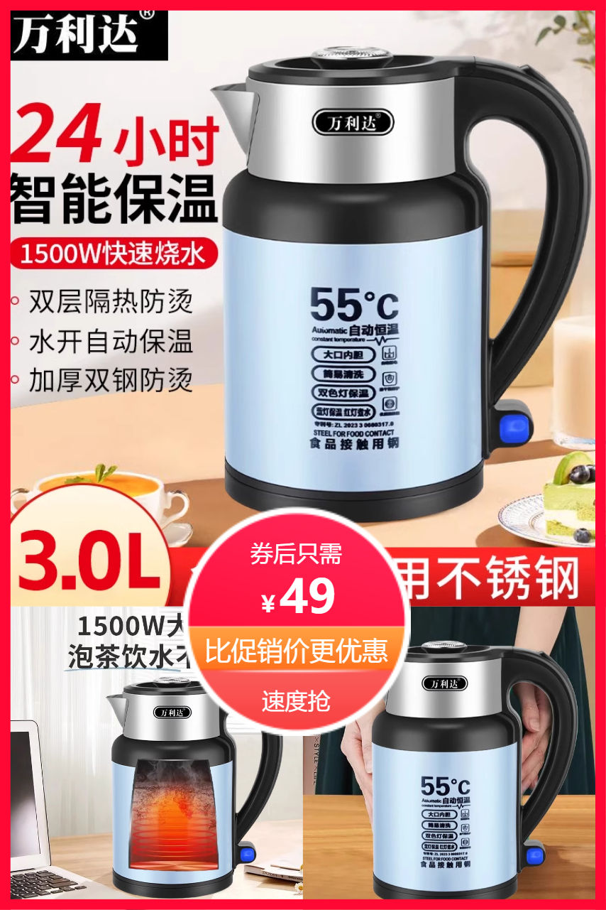万利达电热水壶采用食品级304不锈钢内胆,耐腐蚀且无重金属析出,搭配PP材质外壳,隔热防烫更安全。壶身双层真空设计,有效减少热量流失,实现持久保温。