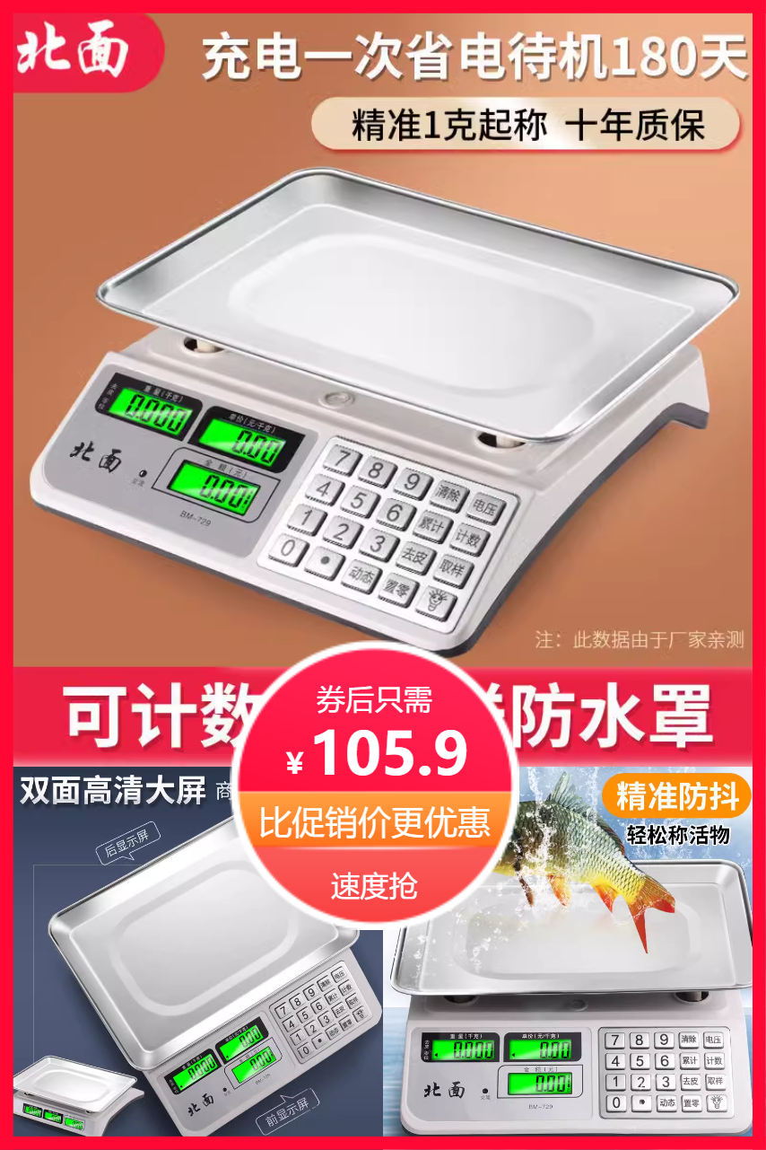 防脏耐用,智能充电,100g-30kg称量,5g高精度,前后双屏显示,5年质保,加厚不锈钢秤盘。