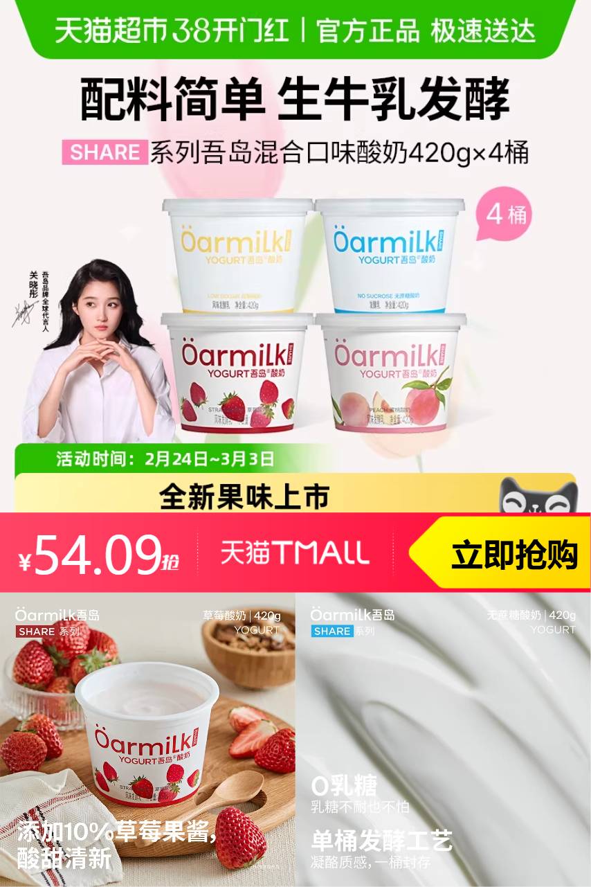 Oarmilk吾岛酸奶以100%生牛乳为基底,采用72小时低温慢发酵工艺,0蔗糖、0明胶、0香精,保留天然乳香与活性益生菌。每100g含3.2g蛋白质,热量低于普通酸奶30%,控糖人群也能安心享用。