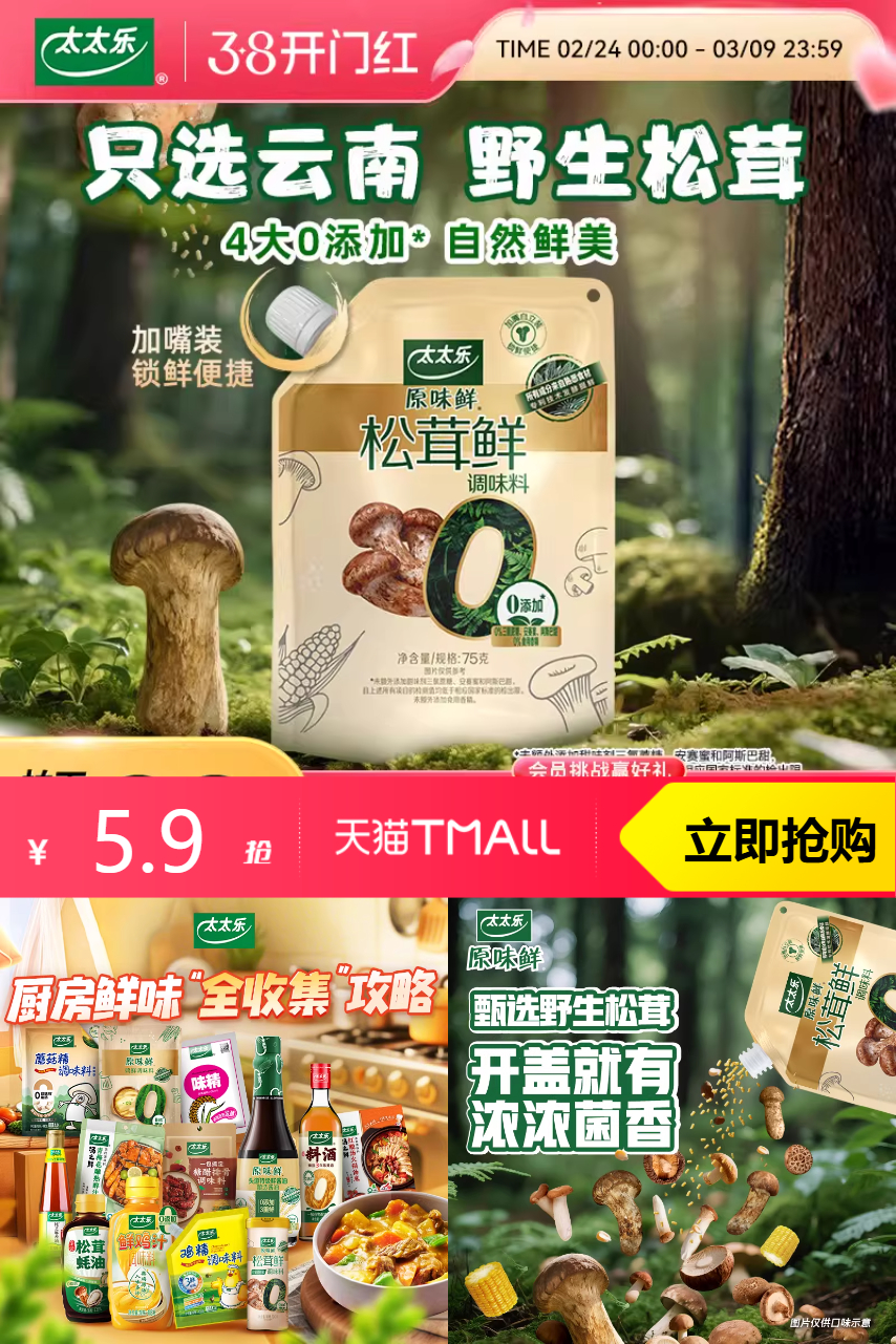 太太乐松茸鲜0添加调味料,以自然之力重塑健康鲜味,让每一餐都成为对家人的温柔呵护。现在下单,享限时优惠+回购礼金,把山珍之味带回家!