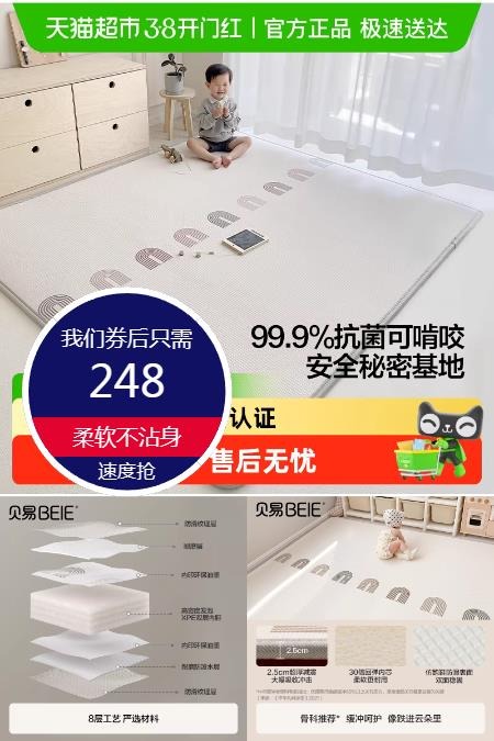 【淘金币抵扣17.3元+88会员再减11.15元+购物券20券+消费券!】120*180*2cm厚!贝易宝宝爬行垫,采用正面布面桃皮绒材质,安全环保无异味,柔软不沾身,透气不闷汗,防水易打理,天冷了赶