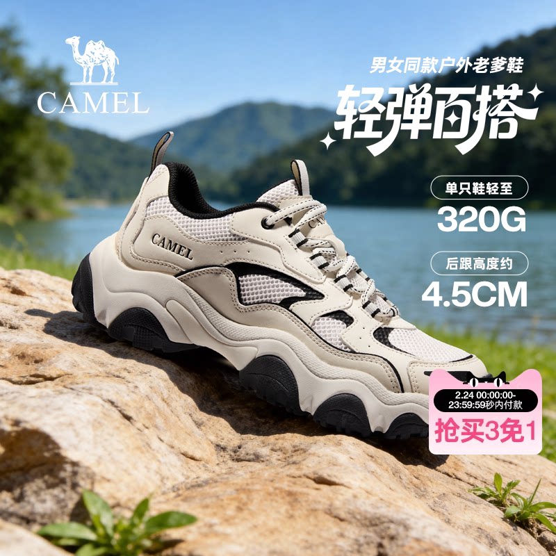 解决老爹鞋"笨重、闷脚、不防滑"三大痛点,骆驼集团20年户外鞋研发背书,累计销量超50万双,穿过的人90%会复购第二双。